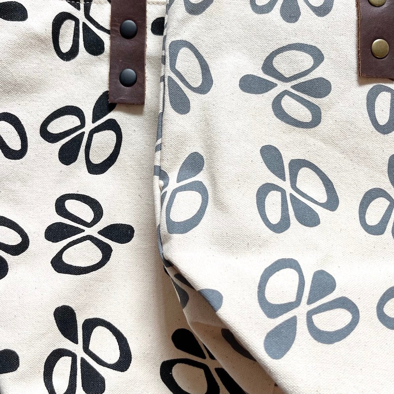 Materials: Cotton canvas, cotton fabric, leather handles, brass rivets and water-based inks.